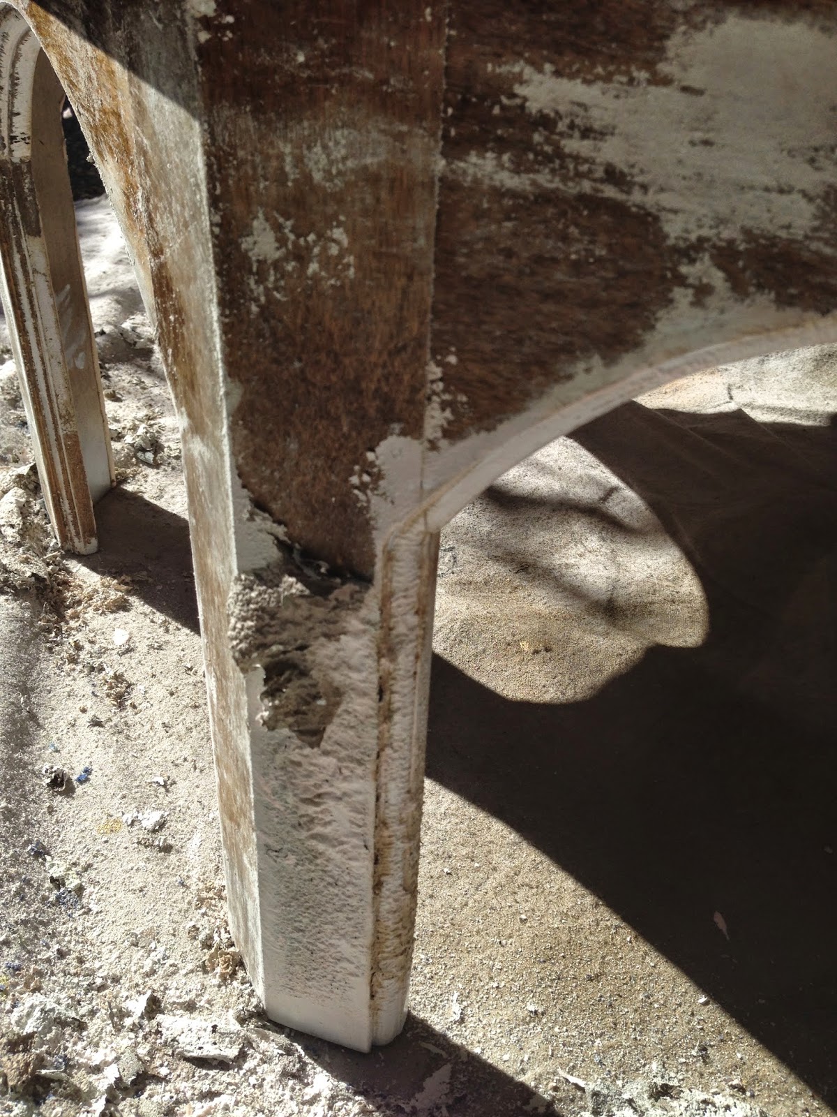 I was itching to get started to see what would come of this guy with a little elbow grease, so I followed the advice I read on Little Green Notebook and Little Black Door and quickly got to work. I applied Citristrip all over the table and found that so long as I put it on thick enough, it took the paint right off the legs of the table.